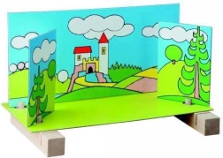 A vár témájú mágneses színház kis színpaddá varázsolja az asztalt, ahol a gyerekek a mágneses vezető pálcákkal könnyedén mozgathatják a szereplőket. A beépített mágnessel ellátott fa figurák simán siklanak a színpadon, a kétféle díszletnek köszönhetően pedig könnyen variálhatók a történetek.