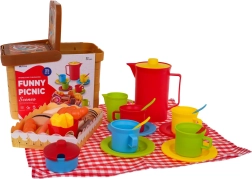A készlet tartalma: füles kosár, piknikpléd, kartontálca, nagy és kicsi csőrös kanna, 4 tányérka, 4 pohárka, 4 kiskanál, fedeles fazék, finomságok kosara (croissant, 7 db keksz, csokoládé, gofri, hot dog, hasábburgonya és ketchup).