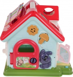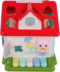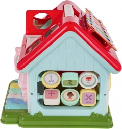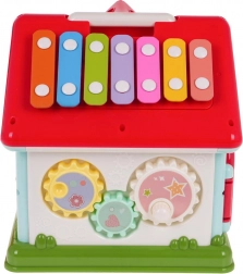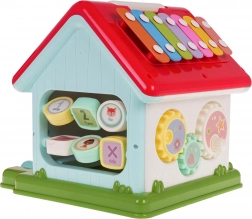 A ház tetője xilofont rejt az első zenéléshez és formaválogatót 6 színes kockával. A gyerekek gyakorolják a finommotorikát, szem–kéz koordinációt és a logikus gondolkodást. A masszív, minőségi műanyagból készült, élénk színű kivitel első pillantásra magával ragad, és a lehajtható fogantyúval a házikó könnyen hordozható.