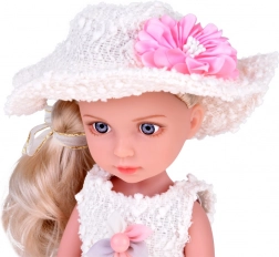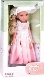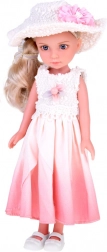 Ennek a babának hosszú, szőke haja van, elegáns copfba fonva, és csinos koktélruhát visel rózsaszín árnyalatokban, ezüstös vállpántokkal. Finom virág díszíti, és krémszínű bolerót hord. A fején stílusos, krémszínű kalap található, amely bájt és eleganciát kölcsönöz neki, a lábán pedig fehér cipőcskék vannak. Egyszerűen elragadó!