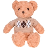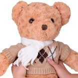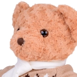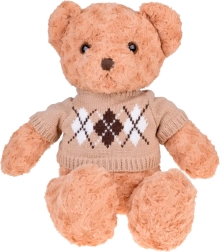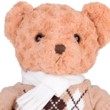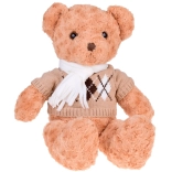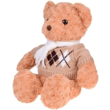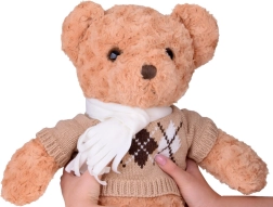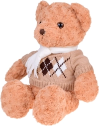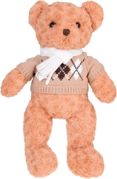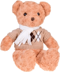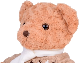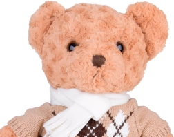 A maci stílusos, elegáns pulóvert és krémszínű sálat visel, ami még bájosabbá teszi, és felkészíti a téli kalandokra. Tökéletes játszótárs, hű barátja lesz gyermekeknek és felnőtteknek egyaránt. Tökéletes ajándék bármilyen alkalomra!