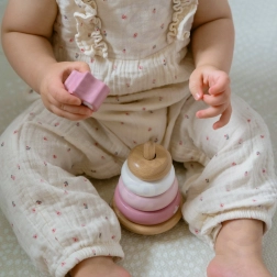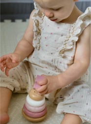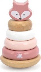 Ez a fa rakosgató játék 6 elemet tartalmaz finom pasztellszínekben, beleértve a felső rókafejes darabot. A gyerekek méret, szín vagy éppen fantázia szerint fűzik fel a karikákat a középső rúdra – így gyakorolják a logikus gondolkodást, a türelmet és a térbeli észlelést.