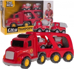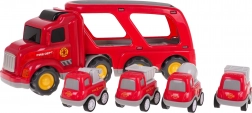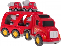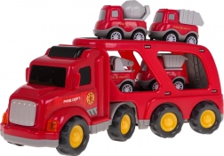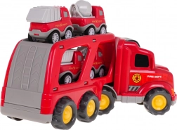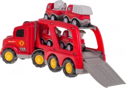 Ez a részletgazdag tűzoltó járműkészlet hosszú órákon át tartó kreatív szórakozást nyújt a gyerekeknek. A nagy szállító kamion levehető pótkocsival egyszerre négy kisebb munkagépet szállít. A fülke tetején lévő gomb megnyomására felkapcsolnak az első lámpák, és megszólalnak az autentikus indítás-, menet- és dudahangok.
