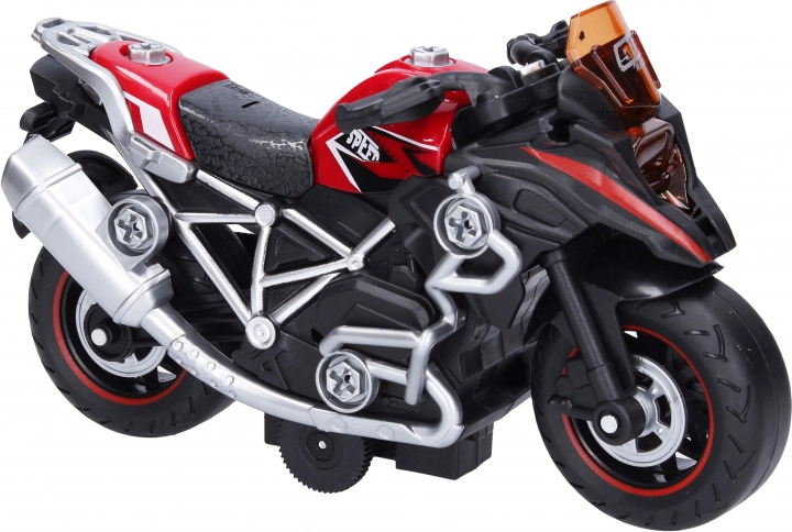 Piros csavarállványos motor effektusokkal, fény- és hangeffektekkel, méretek: 20x8,5x12 cm. Tartalmaz csavarhúzót és kulcsot.