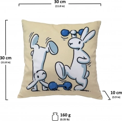 Pihe-puha párnácska BOB A BOBEK nyuszikkal és súlyzós mintával, amely otthon és útközben is örömet szerez a gyerekeknek. Mikrovelúr, üreges szál, 30 °C-on mosható, kézzel készült Csehországban, méret 30 × 30 cm.