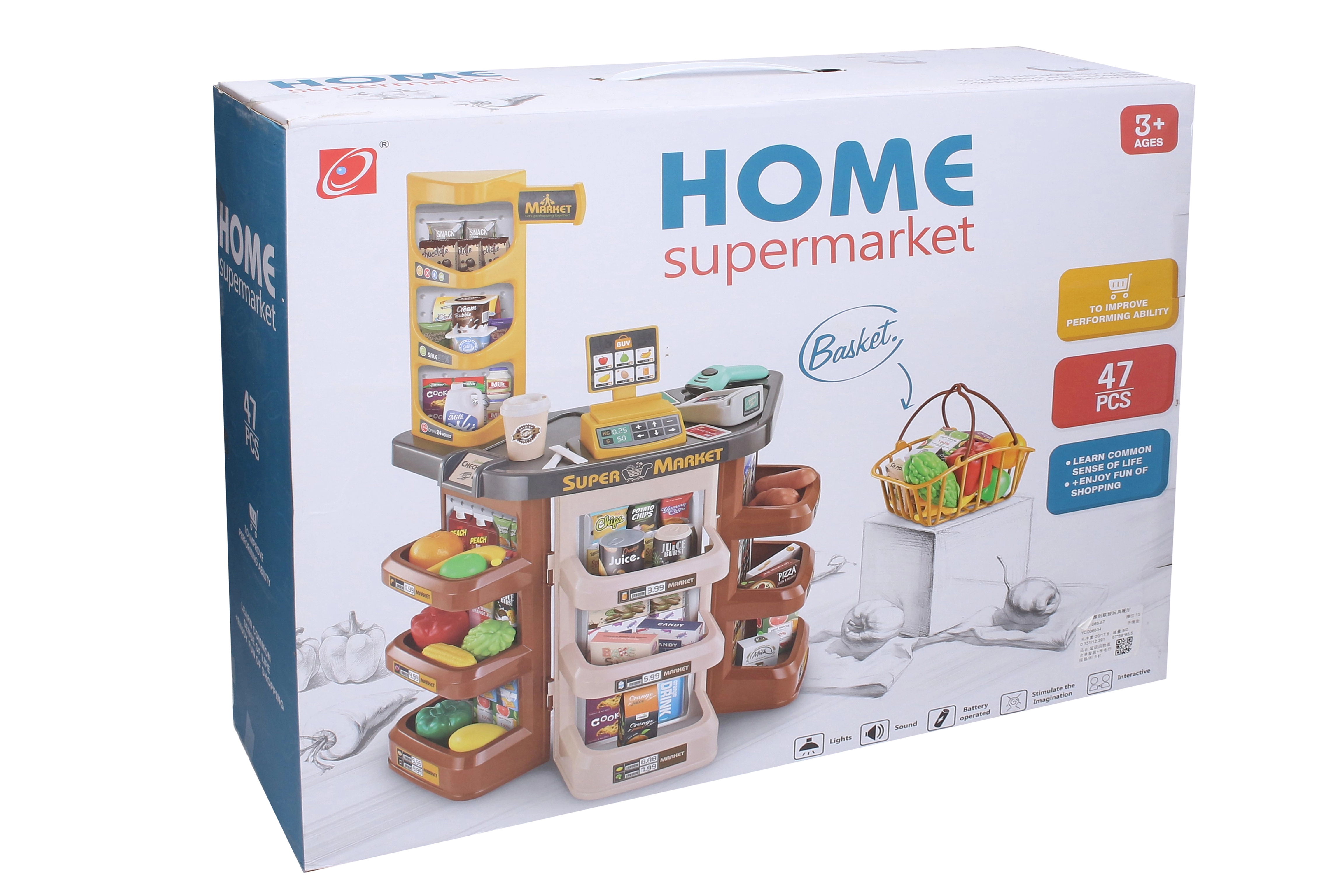 A szett tartalmaz pulttal ellátott szupermarketet, pénztárgépet, vonalkódolvasót, fizetési terminált és bankkártyát. Nem hiányoznak a bankjegyek, érmék, bevásárlókosár és a sokféle élelmiszer, mint a gyümölcsök, zöldségek, tej, kávé, gyümölcslé, keksz, pizza vagy mogyoró. Az összeállítást segítő képes útmutató a csomagolás alján található.