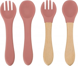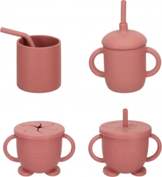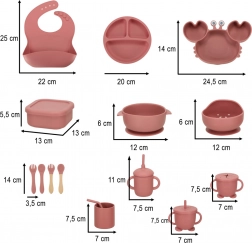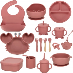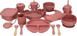 Teljes szilikon étkészlet gyerekeknek sötét rózsaszín színben tartalmaz tányérokat, tálakat, csészéket és evőeszközöket. Az étkészlet biztonságos szilikonból készült, könnyen tisztítható, és ideális az önálló étkezés tanulásához.