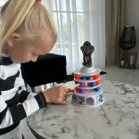A minőségi PS anyagnak köszönhetően az elemek könnyűek, mégis erősek, a gyűrűk és pálcikák pontos kivitelűek, így a játék biztonságos 3 éves kortól felnőtt felügyelete mellett. A vidám színek segítik a színfelismerést, a mechanika pedig kiválóan edzi a finommotorikát és a türelmet.