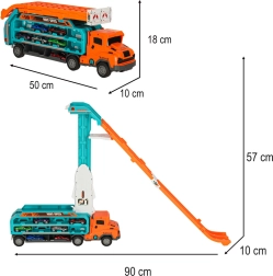 A multifunkciós kamion első ránézésre praktikus autószállító – akár 6 kisautót is elbír, és megkönnyíti a szállítást. Pillanatok alatt látványos versenyszetté alakul két párhuzamos pályával az akciódús futamokhoz és a testvérek fair play szórakozásához.