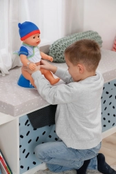 Bemutatjuk Jonast! A BABY born animációs sorozatból ismert Jonas babát, amelyet magyarul is nézhetsz a BABY born csatornán a YouTube-on, most otthon is magadénak tudhatod. Új ruhában és 10 kiegészítővel érkezik. Varázstányért is hoz magával: ha egy kis vizet öntesz a fehér betéttel ellátott tányérba, a betéten finom étel aranyos arccal jelenik meg, ami még szórakoztatóbbá teszi a baba etetését. Ha Jonas etetés (vízzel) vagy az üvegből ivás után a bilire kerül, és megnyomod a pocakját, a bili betétjén megjelenik a pisilés és kakilás képe. Ha Jonas vizet iszik az üvegből, könnyeket hullajthat, és meg kell nyugtatni. Ebben segíthet a varázscumi: ha a szájában 180 fokkal elfordítod, a szemei vagy kinyílnak, vagy becsukódnak. Fordítsd el újra, és az ellenkezője történik. Jonas azonban még többre képes: mozgatható ízületei vannak, és fürdőkádba is viheted. Most még gyorsabban szárad, mint valaha: a játék utáni alapos tisztításhoz az egyik láb levehető, így nagyobb nyílás keletkezik a baba tisztításához. A víz így könnyebben ki tud folyni a babából. A még érdekesebb játék érdekében Jonas az üvegen, cumon, az ételképes tányérbetéten és a pisilős-kakilós képpel ellátott bili betéten kívül pelenkát, születési anyakönyvi kivonatot, matricás ívet és két barátságkarkötőt is hoz – egyet a babának és egyet a kis anyukának – a gyermek és a baba közötti hosszú és szeretetteljes barátság bizonyítékaként.