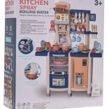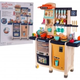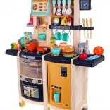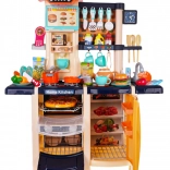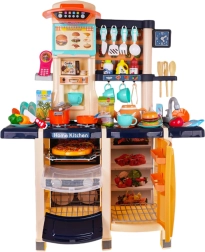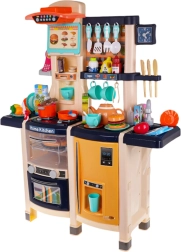 Nagy gyerek konyha működő folyó csappal, élethű fény- és főzési hangokkal, valamint gazdag felszereléssel, 65 darabbal. Tartalmaz sütőt, vízadagolós hűtőt, mosogatógépet, kávéfőzőt, ventilátorpanelt és hangos telefont is. Minőségi műanyag, élénk színek és átgondolt részletek ösztönzik a gyerekek kreatív játékát 3 éves kortól.