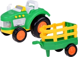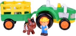 Szórakoztató gyerek traktor utánfutóval és figurákkal, amely motor- és riasztóhangokat, világító első fényszórókat, nyitható utánfutót és guruló kerekeket kínál. A készlethez tartozik a gazda, a ló és a bárány figurája; ideális játék a farm kedvelőinek 3 éves kortól.