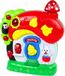Az interaktív házikó tökéletes választás a mindennapi játékhoz és az esti megnyugváshoz. A természethangok lecsendesítik a babát és álomba ringatják, miközben az állatok a saját jellegzetes hangjaikat adják ki. Dupla megnyomással elindítható a zenei aláfestés, a vizuális élményekről egy kis világító légyölő galóca és egy tetőfény gondoskodik.