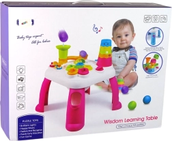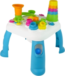 Színes, interaktív asztal a legkisebbeknek, amely egyesíti a szórakozást és a tanulást. Fényhatásokkal, formabedobóval, golyópályával, forgó fogaskerekekkel és levehető lábakkal rendelkezik. Támogatja a finommotorikát, a formák és színek felismerését, valamint az érzékelés fejlődését. Stabil, biztonságos kialakítás nem mérgező anyagokból, 18 hónapos kortól ajánlott.