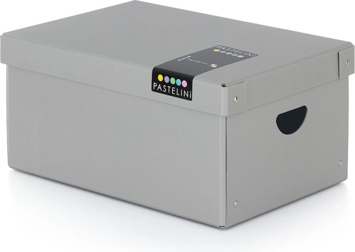 Nagy laminált doboz PASTELINI elegáns szürke színben, amely ideális a különféle tárgyak tárolására. Okos kialakításának köszönhetően, amely tartalmaz egy fedelet és fogantyúkat, könnyen kezelhető.