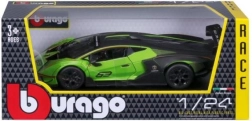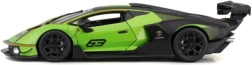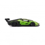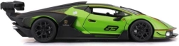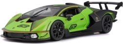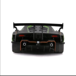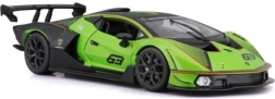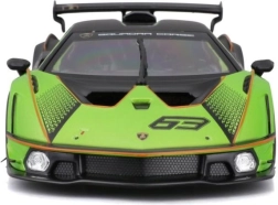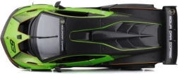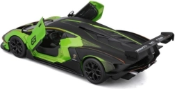 A feltűnő zöld színkombináció, a nagy szárny és a sportos részletek hűen adják vissza a Lamborghini Essenza SCV12 karakterét.
