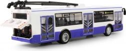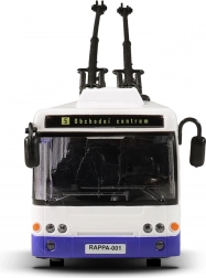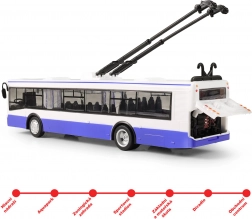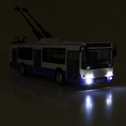Gyors beszállás, ajtók zárva, indulás! Ez a valósághű, 28 cm hosszú, 1:43 méretarányú trolibusz cseh nyelven jelenti be a megállókat, és felhúzós hátramenettel közlekedik. A nyitható ajtók kézzel működtethetők, a tetőn lévő gombbal történő automatikus zárást villogó első lámpák és cseh bemondás kísérik. Az elemek a csomag részei – remek ajándék kis sofőröknek és a környezetbarát közlekedés rajongóinak.