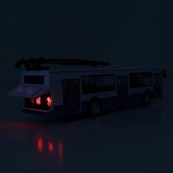 A kezelése egyszerű és szórakoztató: az ajtókat kézzel nyithatja, a tetőn lévő gomb megnyomásával zárhatja, és közben figyelheti, ahogy villognak az első lámpák. A trolibusz felhúzós hátramenettel működik, így könnyedén elindul a padlón. Az LR44/AG13 elemek a csomagban vannak, így a kicsomagolás után azonnal indulhat a játék.