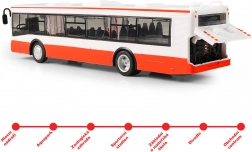 Ez a részletesen kidolgozott, 28 cm hosszú műanyag busz életre kelti minden gyerek utazását. Az ajtók kinyitásakor magyar nyelvű megálló-bemondások hallhatók, bezáráskor pedig villognak az első lámpák. A visszahúzós mechanizmusnak köszönhetően a busz magától elindul, és rengeteg akciódús szórakozást nyújt.