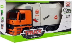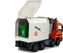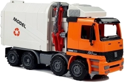 A nagy, narancs-fehér szemetesautó valósághű szelektív hulladékgyűjtős játékot kínál. A masszív kivitel, a nyitható konténer és a súrlódó meghajtás egyenletes haladást és sok akciót biztosít rakodás és billentés közben. A nyitott fülkébe beültethetők a sofőr és az utas figurái (nem részei a csomagnak).