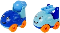 A csomagban 2 műanyag kisautó is található kedves arckifejezéssel – egy betonkeverő és egy létrás tűzoltó – valamint kiegészítők egy kis „benzinkút” otthoni megépítéséhez. A gyerekek könnyedén összeállíthatják saját jeleneteiket jelzőlámpával, táblákkal és sorompókkal.
