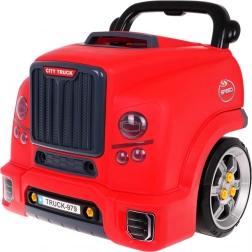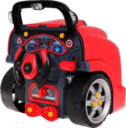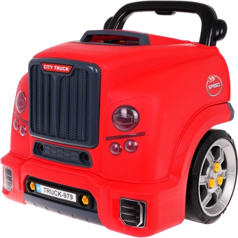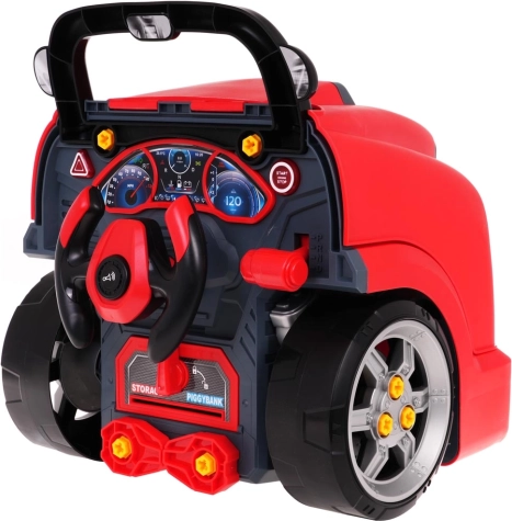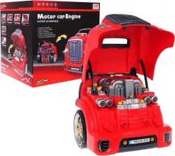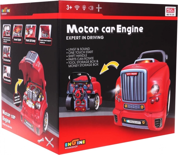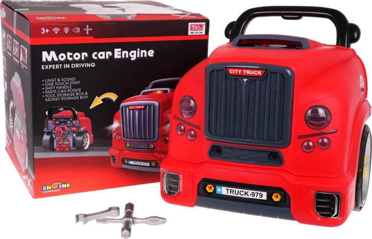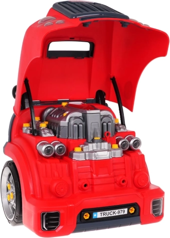 Ez a valósághű interaktív készlet ügyes szerelőkké varázsolja a gyerekeket. A teherautó eleje felnyitható motorháztetővel egy nagy, szétszerelhető motort rejt, ahol gyertyák és kerekek is cserélhetők. A műszerfalon indítógomb indításhangokkal, dudás kormány, vészjelző és sebességváltó kar kapott helyet. A praktikus fogantyú megkönnyíti a hordozást, a kormány alatt pedig szerszám- és csavartartó rekesz található.