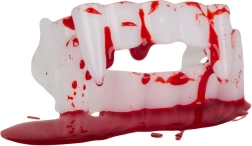 Fehér fogak piros részletekkel, amelyek friss vért imitálnak, és azonnal feltűnő, horrorisztikus megjelenést adnak a jelmeznek.