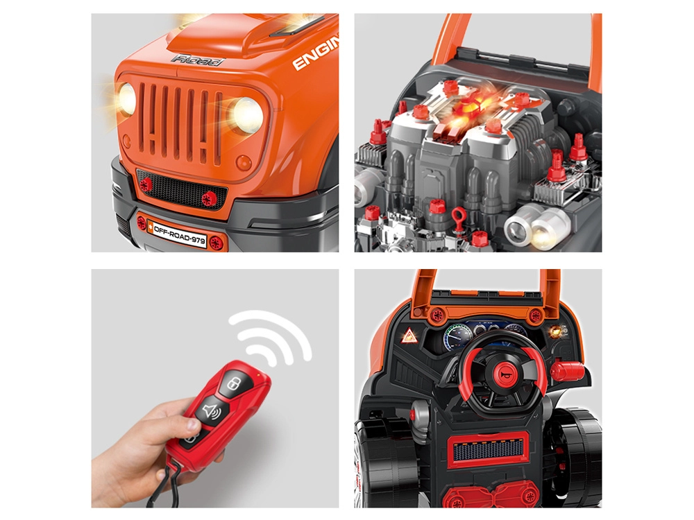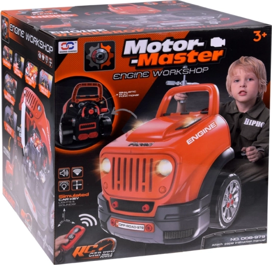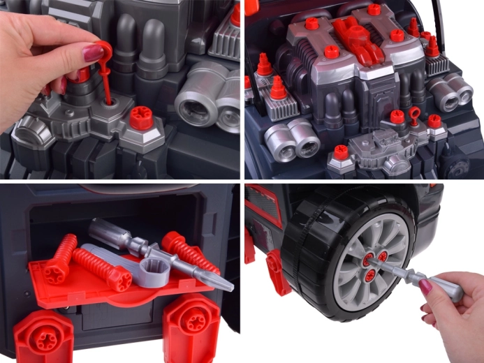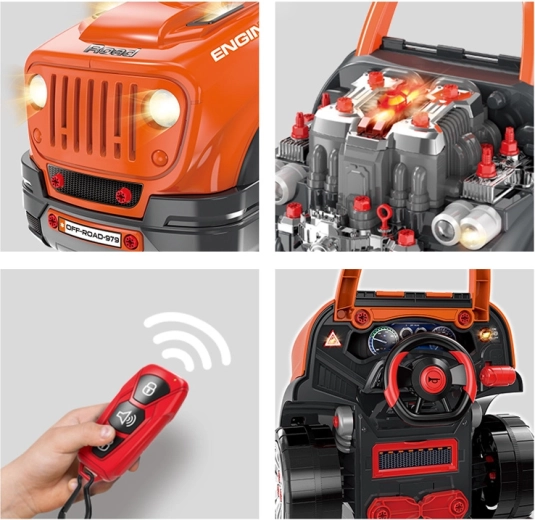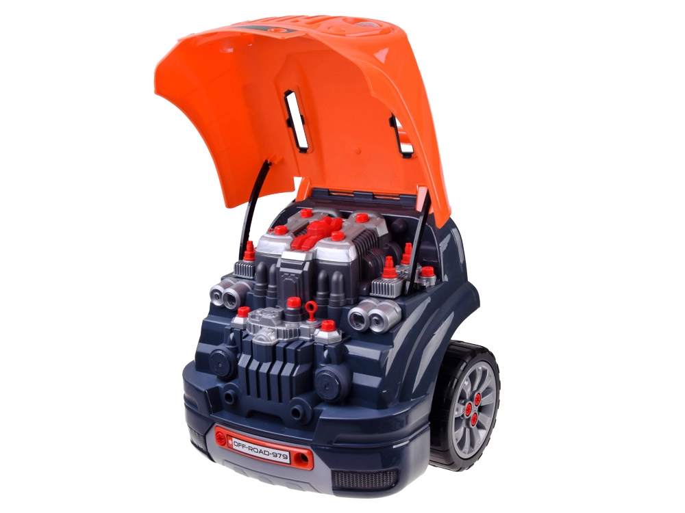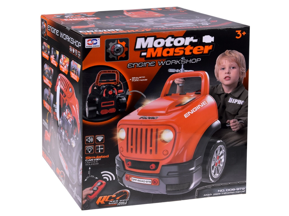 Az interaktív szerelőműhely készlet a kis szerelőknek valósághűen szimulálja az autószerviz munkáját. A gyerekek kinyithatják a motorháztetőt, szétszedhetik és újra összerakhatják a kivehető motort, cserélhetnek kerekeket és dísztárcsákat, kipróbálhatják a gombnyomásos indítást, valamint használhatják a hang- és fényeffekteket – a dudától és a hátramenettől a riasztóig és a vészvillogóig.
