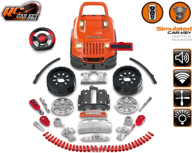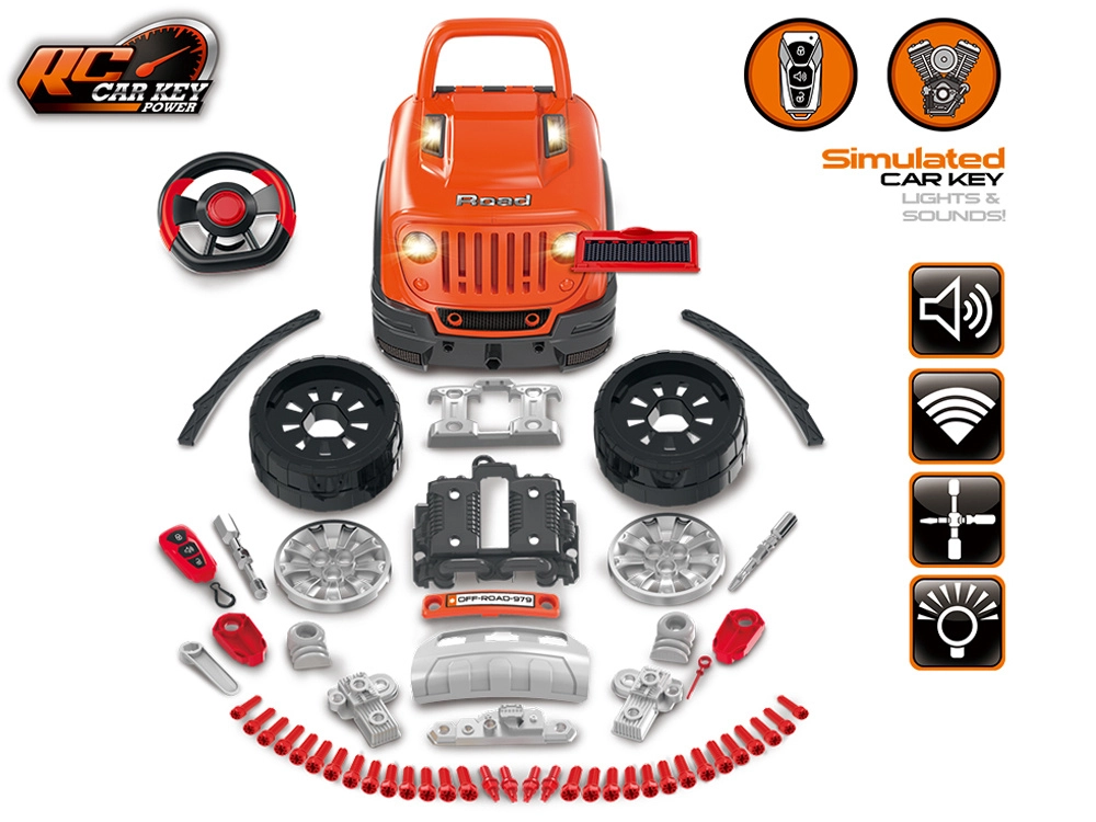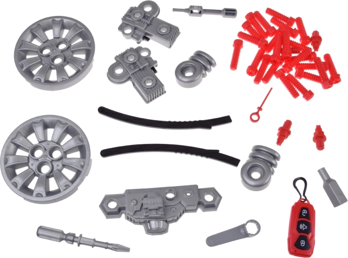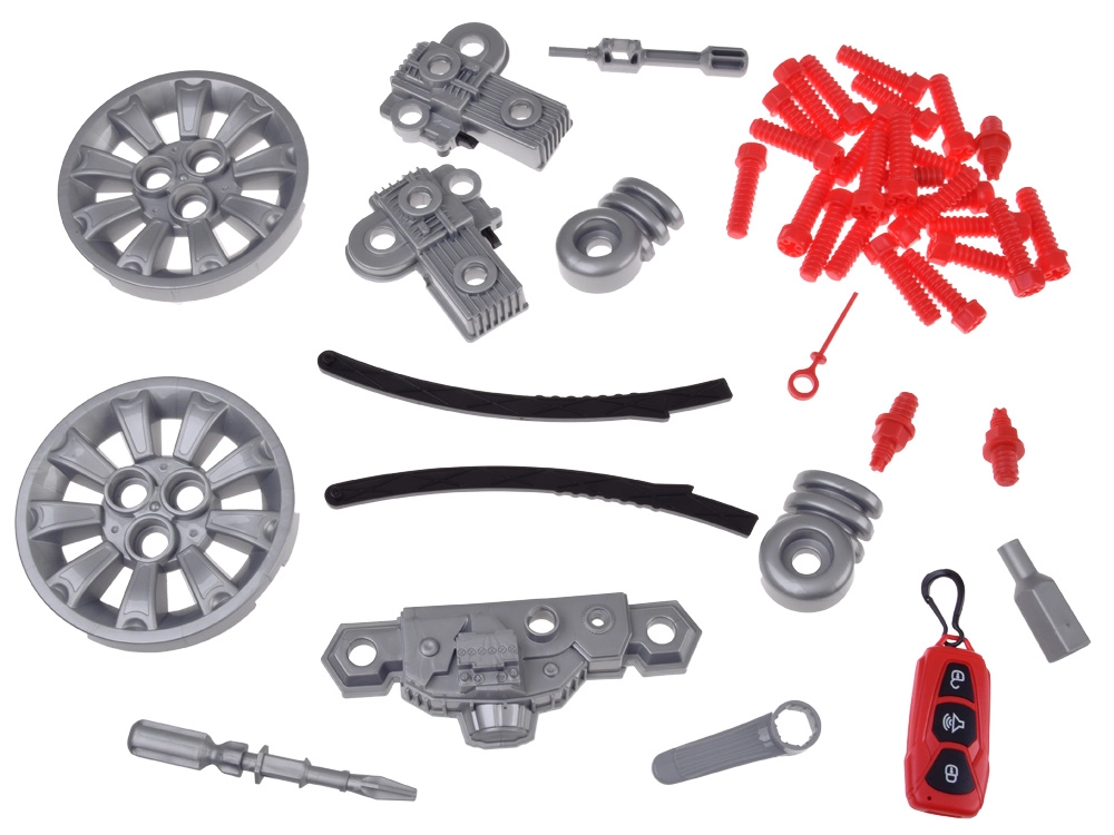 A készlet gazdag tartozékokkal érkezik: csavarok, csavarhúzó imbuszkulccsal, 4-irányú szerszám, olajmérő pálca és szűrő, rendszámtábla, valamint támaszok az autó „megemeléséhez”. A forgatható kormány működő dudával és a váltókarral további szórakozást nyújt.