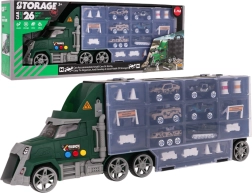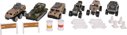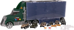 A szett 6 fém/rugós „resor” típusú kisautót és gazdag tartozékokat (bólyák, kerítések, sorompók, hordók) tartalmaz saját akadálypályák és katonai jelenetek építéséhez. A praktikus hordozó fogantyú megkönnyíti, hogy a gyermek bárhová magával vigye a teherautót.
