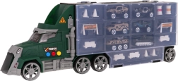 Ez az interaktív katonai teherautó órákon át tartó fantáziadús játékot és praktikus tárolást kínál. A pótkocsi oldalain nyitható tárolórekeszek vannak a kisautóknak és kiegészítőknek, a fülke tetején pedig kisautó-csúszda. A fülke világít, és a gomboknak köszönhetően indításhangot, dudát és vidám dallamot játszik le.