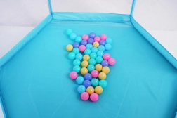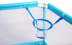 A járóka belsejében található integrált kosár támogatja az aktív játékot és a koordináció fejlesztését. A csomag 50 színes labdát tartalmaz.