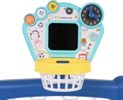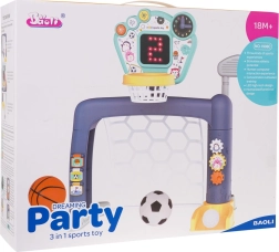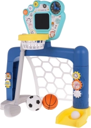 Interaktív 3 az 1-ben futball-, kosárlabda- és golfkészlet, 18 hónapos kortól. A panelen három gomb található az üzemmódok közti váltáshoz. A játék 3 db AA 1,5 V-os elemmel működik (nem része a csomagnak). .A játék üzemmódjai: . - FUN gomb: a gyerekek meghallgatják az utasításokat, majd követik azokat, .- MOZGÁS gomb: képeket indít a táblán hangokkal és zenével, .- KIKAPCS gomb: a totyogó irányítja a táblán megjelenő eredményeket. .A játék funkciói: . - 18 hónaposnál idősebb gyermekek számára alkalmas, .- 3 választható játék: golf, kosárlabda, dobozdöntés labdával; változatos játéklehetőségek, .- óra mozgatható mutatókkal az idő tanulásához, .- fogaskerekek a finommotorika gyakorlásához, .- fűzős füzetek, .- interaktív panel hang- és fényhatásokkal. |