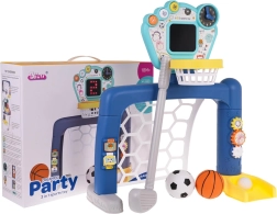 futballkapu kosárgyűrűvel, .- gumírozott kosárlabda, .- gumírozott futball-labda, .- gumírozott golf labda, .- golfütő, .- interaktív panel pont- és fénykijelzéssel, .- használati útmutató, .- golyótartó tok. . |