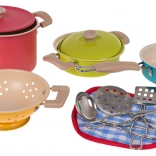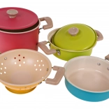 Ez a színes gyerek edénykészlet valósághű főzési élményt visz minden gyerekkonyhába. Két lábas fedővel, serpenyő, szűrő és négy praktikus konyhai eszköz biztosít mindent, amire a gyerekeknek szükségük van a valódi főzés utánzásához. A fém anyagoknak köszönhetően a készlet masszív, tartós és készen áll a mindennapos játékra.