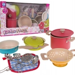 Két lábas fedővel, serpenyő és szűrő fémből, amelyek élethű hatást keltenek és bírják az intenzív gyerekjátékot.
