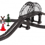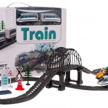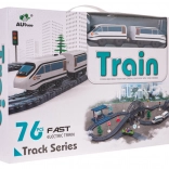 - Komplett, 76 darabos készlet – sínek, vonat, állomás, híd, alagút, TAXI, táblák, fák és további kiegészítők.
