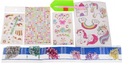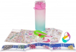 - palack, .- nyakpánt, .- toll, .- műanyag tálca, .- ragasztó négyzet, .- 6 zacskó strassz, .- 1 unikornis motívumos ív (14 matrica), .- 1 gyémántos ív (408 db strassz), .- 1 virágkompozíciós gyémántlap, .- 1 kompozíciós matricás lap, - „Higgy magadban” feliratos matrica. . |