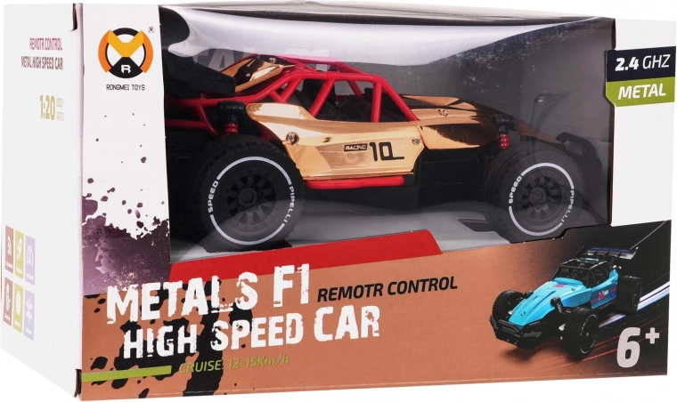 Arany fém kisautó távirányítóval 6 évnél idősebb gyerekek számára készült, akik élvezni akarják a gyors járművek izgalmát. A modell 1:20 méretarányú, és gumiabroncsai kiváló tapadást biztosítanak a felületen. Fém karosszériája nagy tartósságot biztosít, így ideális játék aktív gyerekek számára.