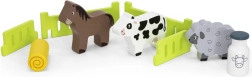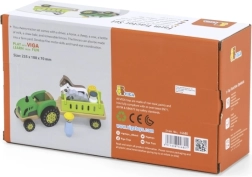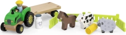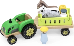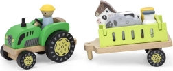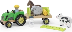 Faktraktor állatokkal a neves Viga Toys márkától ideális készlet az állatbarátok számára. Ez a vidám traktor vezetővel, lóval, báránnyal, tehénnel, tejesüveggel, szénabálával és levehető oldalú utánfutóval van felszerelve.