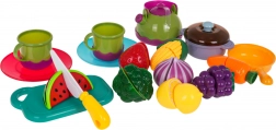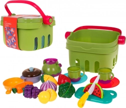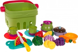 Kosárral, fedéllel, vágódeszkával, késekkel, fazekakkal, serpenyőkkel, poharakkal és egyéb konyhai kiegészítőkkel a valósághű játék érdekében.