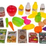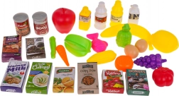 A gazdag, 41 darabos készlet gyümölcsöket, zöldségeket, italokat, konzerveket, élelmiszeres dobozokat és dekoratív matricákat tartalmaz. A gyerekek gyakorolhatják az élelmiszerek felismerését, a színeket, a számolást és a kommunikációt. A tápellátást 3× AG13 elem biztosítja (a csomag tartalmazza).