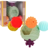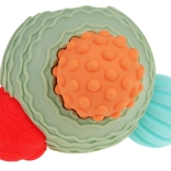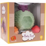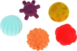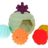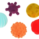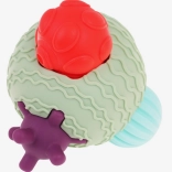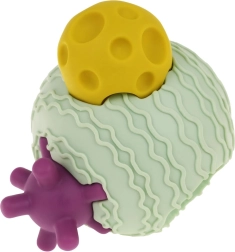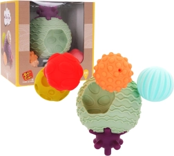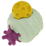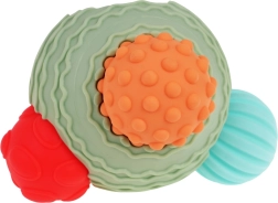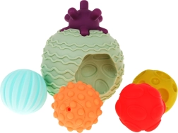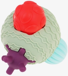 Ez a szenzoros golyó ideális társ a kicsik fürdéséhez. A készlet egy nagy golyót és négy kisebb, különböző textúrájú és formájú golyót tartalmaz. A fő golyó mélyedésekkel rendelkezik, ahová a kisebb golyók helyezhetők, ami segíti a gyermeket a különböző színek és formák felismerésében.