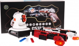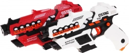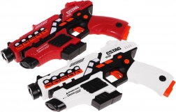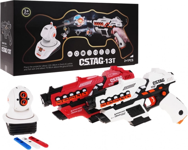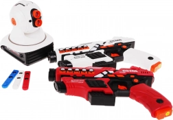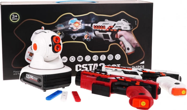 Szórakoztató lézeres készlet 3 éves kortól, amely akciódús játékot kínál otthon és a szabadban. A csomag tartalma 2 könnyű lézerpisztoly és egy interaktív projektor 3 cserélhető diával (kacsák, dinoszauruszok, UFO). Játszhattok egymás ellen vagy kivetített célpontokra, választható 5 lövészmóddal, akár 4 csapatban, hangeffektekkel, rezgéssel és biztonságos infravörös technológiával.