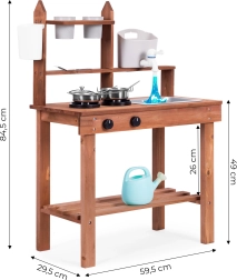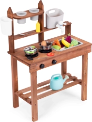 Támogatja a szerepjátékot, a gyerekek „főzhetnek” homokból, sárból vagy kavicsokból. Az áttekinthető polcok és akasztók kéznél tartják az edényeket, a kompakt méretek pedig a kisebb terekben is könnyű elhelyezést biztosítanak.