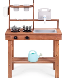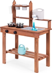 Ez a masszív sárkonyha valósághű főzést hoz a gyerekek világába. A működő csappal és tartállyal valódi víz áll a kis szakácsok rendelkezésére, a két főzőlap forgatógombokkal és a gazdag fém tartozékok pedig még több élményt adnak. A természetes lucfenyő fa ellenáll a kerti, teraszos és beltéri játékoknak is.