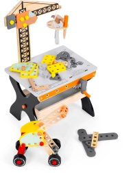 A munkapad daruval, szerszámokkal és kötőelemekkel fejleszti a fantáziát, a finommotorikát, és biztonságos formában tanítja meg a barkácsolás alapjait.