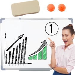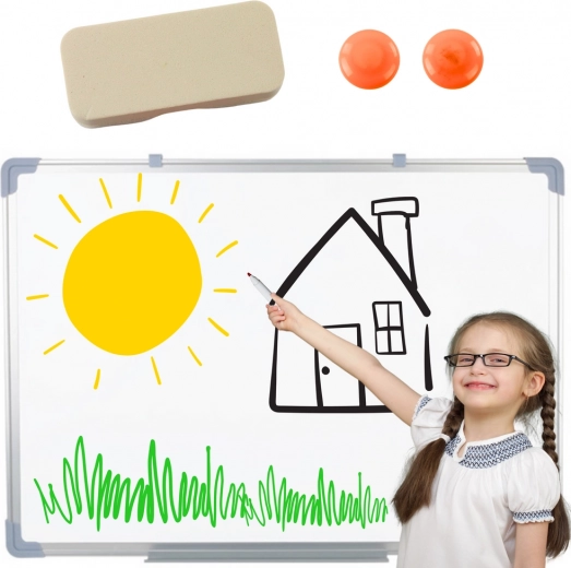 Kompakt fehér mágneses, szárazon törölhető tábla 45 × 60 cm alumínium kerettel, ideális irodába, iskolába és otthonra. Sima felületet kínál ismételt íráshoz, könnyű fali rögzítéssel, és azonnal használatra kész a csomagban található szivacsnak és 2 mágnesnek köszönhetően.