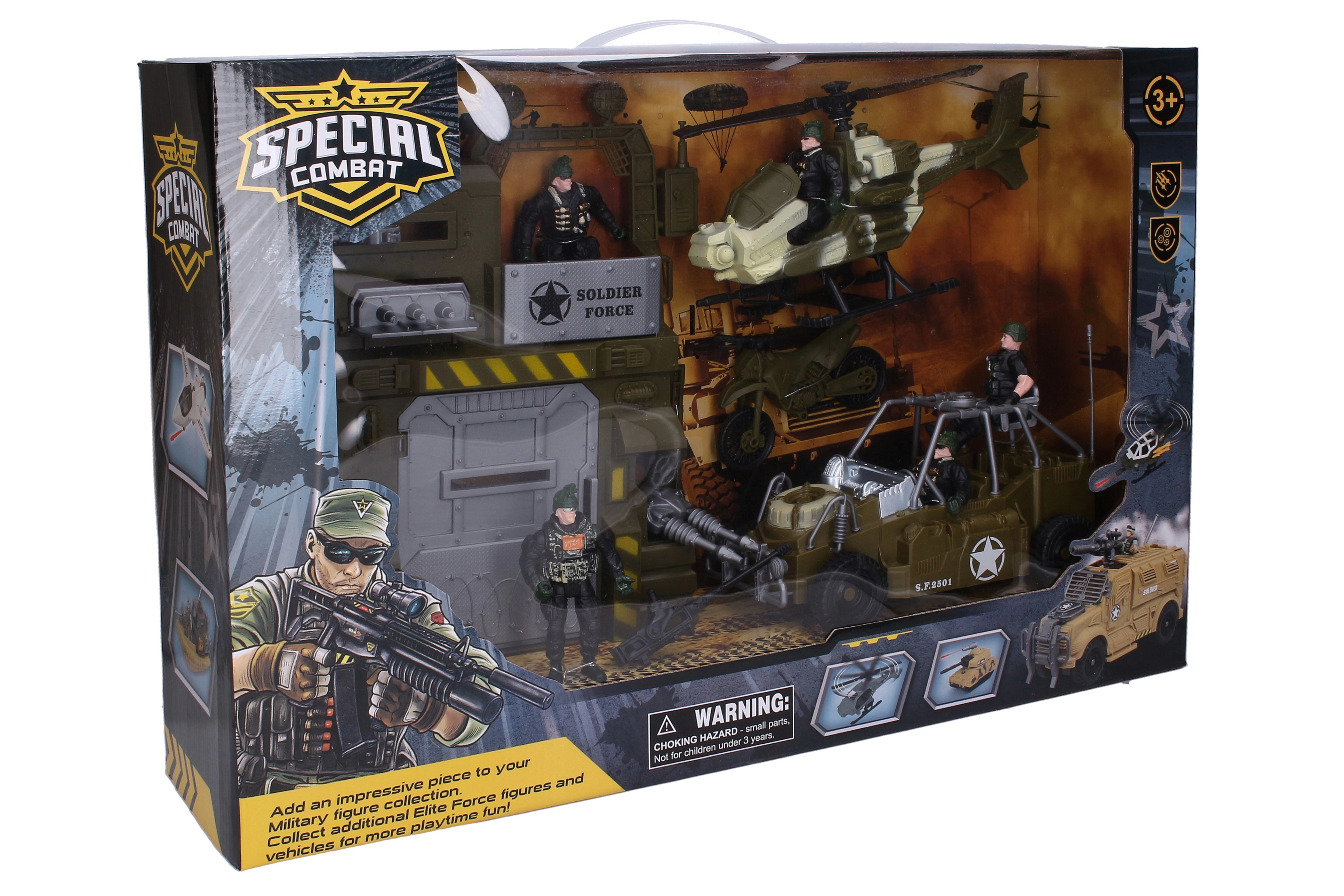 • Komplett felszerelés: autó, helikopter, motor, 5 katona, fegyverek és kiegészítők