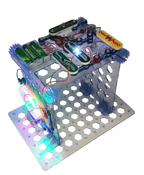 Minden alkatrész könnyedén a átlátszó rácsra pattintható. Az építés gyors, áttekinthető, és ideális az elektronika első lépéseihez.